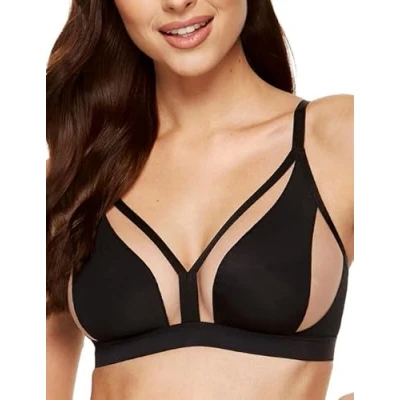 Comfortable bra without underwire with soft cups made of black fabric and mesh. Ideal for everyday use. Adjustable, non-removable straps. Bra without underwire. Composition: Polyamide, Polyester, Elastane