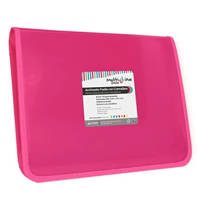 File folder with bellows made of polypropylene with vertical striping. Size Folio, 13 positions Fuchsia pink with zip closure. With labels for vicessors: alphabet, months and customizable This folder is perfect for sorting and archiving all kinds of office, home or school documents
