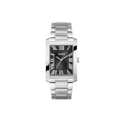 Men's watch from Guess, model Clyde Stainless steel case silver-coloured, housing W x H approx. 33.50 x 45.00 mm (without crown). Case height: approx. 7.0 mm Stainless steel bracelet, silver-coloured, folding clasp Black dial, hours - minutes - seconds display The watch comes in a beautiful gift box