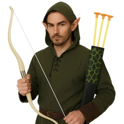 Arrow and bow Indian set costume accessory for children and adults Box contents: 4 pieces. Bow, arrow pocket and 3 arrows with suction cup (without costume) One size fits all (bow length: 50 cm, arrow length: 34 cm) - material: 100% plastic Beautiful bow and arrow set suitable for children and adults. The Indian set includes an ivory bow, three arrows with orange suction cup and a small arrow pocket. The bag is designed in animal print on the front, the back is completely black. Ideal costume accessory for fancy dress, carnival, theme party or children's birthday party Please note: Not suitable for children under the age of 3. Choking and strangulation hazard To be used under the direct supervision of an adult., Manufacturer: Müller & Küssner GbR