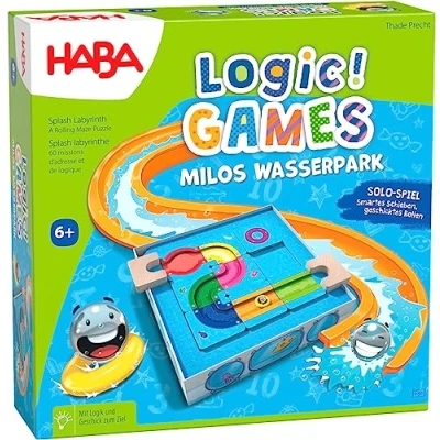 Giant gliding fun with the HABA game: Logic! Games Milos - Water park Delicate logic game for ages 6+ with 3D game construction and sturdy gaming hardware 60 tasks with an increasing level of difficulty ensure great fun with the sliding puzzle of HABA With each turn, a new water slide appears, box dimensions: 26.5 x 26.5 cm This variable ball maze trains spatial and logical thinking, Manufacturer: HABA