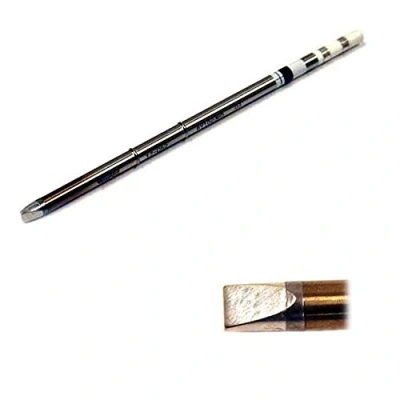 T15 Series Soldering Iron Tip, ‘D’ chisel shape 5.2mm x 7mm x 8mm This shape is capable of any soldering by placing the tip end in 2 ways: line and face. Shape D is also available for soldering at narrow pitches by placing the tip end in Line. Requires slightly more skill than the standard ‘B’ series tips. Suitable for use with the Hakko FM-2027 and FM-2028 Soldering Irons Soldering Iron Tip for the standard irons supplied with the Hakko FM-203, FM-206, FX-951, FX-952 Soldering Stations.