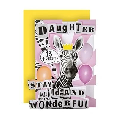 Wish your special daughter a wild 13th birthday, with this brilliant 3D zebra card, from Hallmark Printed on high quality board, made of material from well managed, FSC certified forests and other controlled sources Features a fold-out, die-cut 3D design; comes complete with a co-ordinating, Bright Yellow envelope Message Inside Reads: So proud of you. Welcome to Teenhood! Measures: 22.8 cm by 15.9 cm; Within Standard UK 'Letter' Size Limits