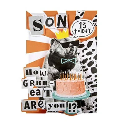 Wish your grrr-eat son a brilliant 13th birthday, with this funny bear-themed card, from Hallmark This product is made using material from well-managed, FSC-certified forests and other controlled sources Features a fold-out, die-cut 3D design; comes complete with a co-ordinating, Pale Turquoise envelope Message Inside Reads: Can't believe you're a teenager already! Happy 13th Birthday Measures: 22.8 cm by 15.9 cm; Within Standard UK 'Letter' Size Limits