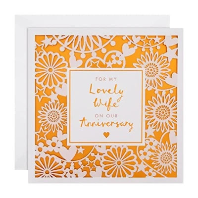 Let your lovely wife know how happy she makes you every day, with this intricate and eye-catching anniversary card from Hallmark. This card is fully recyclable, and made of material from well-managed, FSC-certified forests and other controlled sources Printed on high-quality board with an intricate laser-cut design, over a copper foil background, with copper foil lettering and details and a 2-page paper insert; the card comes complete with a plain white, Hallmark branded envelope. Message Inside Reads: For all the reasons I married you and the hundreds more I've discovered since then For the countless ways you make me happy - I'll never stop loving you. Happy anniversary Card Measures: 19.8 cm by 19.8 cm, Within Standard UK 'Large Letter' Size Limits.