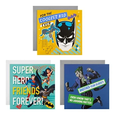 Ideal for fans of Batman young and old, this fantastic bundle of cards, featuring the Caped Crusader, the Justice League and The Joker, are sure to make a birthday to remember, from Hallmark This product is fully recyclable, and made of material from well-managed, FSC-certified forests and other controlled sources Card 1 features a Batman comic book inspired design, embossed elements and blue foil details; comes complete with a silver, Hallmark branded envelope; Card 2 features a Justice League design and embossed elements; comes complete with a white, Hallmark branded envelope; Card 3 features a Joker design and blue foil details; comes complete with a silver, Hallmark branded envelope Message Inside Card 1 Reads: Have a day as awesome as you are! Message Inside Card 2 Reads: You're the birthday hero! Message Inside Card 3 Reads: Ha-Ha-Happy Birthday! All Cards Measure: 16 cm by 16 cm; Within UK Standard 'Letter' Size Limits