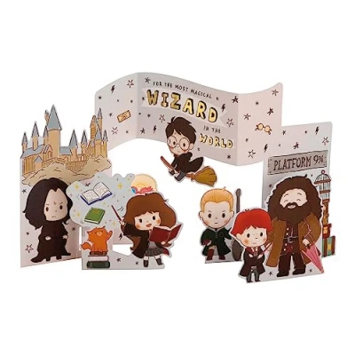 Make their birthday magical and full of enchanting wishes, with this exciting 3D Harry Potter birthday card from Hallmark Printed on high-quality board, this card pops up into an enchanting scene of Harry Potter characters, including Harry Potter, Ron Weasley, Hermione Granger, Draco Malfoy, Luna Lovegood, Hagrid, Severus Snape and Crookshanks the cat, the card features die cut elements, blue foil details and comes complete with a co-ordinating white, Hallmark branded envelope This product is fully recyclable, and made of material from well-managed, FSC-certified forests and other controlled sources Blank inside for your own message Flat Card Measures: 22.8 cm by 15.9 cm, Constructed Card Measures: 20.8 cm by 40 cm by 15 cm, Within Standard UK 'Large Letter' Size Limits