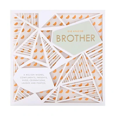 This striking laser-cut 3D Birthday card from Hallmark is the perfect way to celebrate a special Brother on his special day. 3D laser-cut geometric design. Copper foil lettering and design details. 3D Tag attachment. This card is fully recyclable, and made of material from well-managed, FSC-certified forests and other controlled sources. Card features a co-ordinating silver & White printed envelope Message reads: front: one amazing Brother a million wishes, compliments, presents, hugs, celebrations, laughs and photos. Inside: Hope your birthday is the Kind of day that the best memories are made of. With lots of love Measures 16cm by 16cm, within Standard UK 'Letter' Size limits
