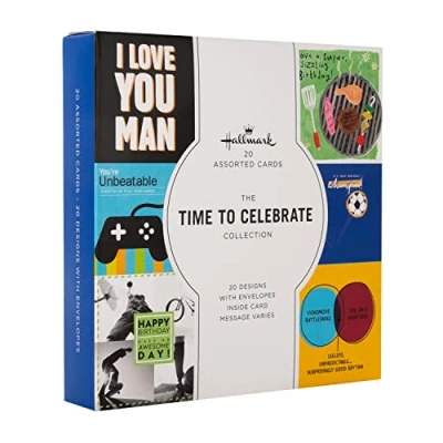 It's time to celebrate all the birthdays in your life, from beers to barbeques, with this pack of 20 assorted Birthday cards, from Hallmark Printed on high-quality board, this pack of 20 Birthday cards comes in 20 unique designs, each card features a coated gloss finish; the cards come complete with co-ordinating white, Hallmark branded envelopes Message inside cards depends on the design, 12 cards have a Birthday message written inside, 8 cards are blank inside for your own personal message This product is fully recyclable, and made of material from well-managed, FSC-certified forests and other controlled sources Cards Measure: 16 cm by 16 cm; Within Standard UK 'Letter' Size Limits