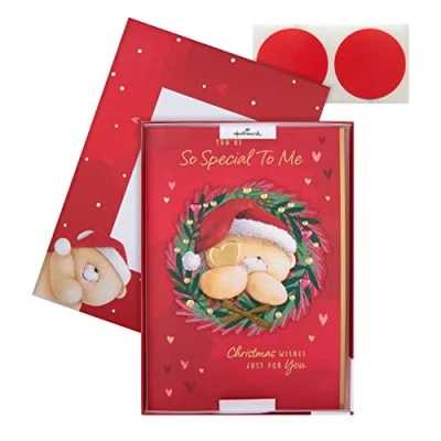 Celebrate the festive feeling with your someone special and make some magical memories, with this adorable Forever Friends Christmas card, from Hallmark. Printed on high-quality 350gsm board, this card features a paper insert, gold foil details, a 3D attachment, a gold paper raffia bow, embossed elements and pink paper heart gems, comes complete with a co-ordinating red, Forever Friends designed presentation gift box, and a pair of red seals Cover Text on Card Reads: You're so special to me - Christmas wishes just for you Message Inside Card Reads: Any time I spend with you is always the best time I ever have... ...because you make me feel extra-special and very happy, whatever we do... So this Christmas I hope we get to enjoy some very merry moments together... Because I can't wait to make lots of amazing memories with you! Love and Hugs at Christmas x This card is fully recyclable, and made of material from well-managed, FSC-certified forests and other controlled sources. Comes complete with a co-ordinating red, Forever Friends designed gift box Card Measures: 30.5 cm by 21.9 cm, Gift Box Measures: 32 cm by 23 cm by 2 cm; Suitable for hand-delivery