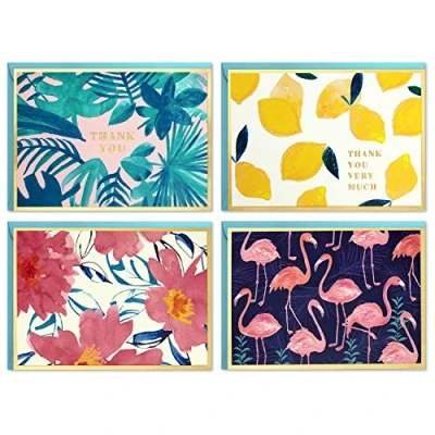 Write a note of appreciation, encouragement, or any other special message with one of four cute designs in this notecard set, featuring tropical greenery, lemons, flamingos, and flowers. Boxed set includes 40 cards (10 of each design). Blank inside, each card has plenty of space to express thanks or write a thoughtful note! Be prepared for any occasion that calls for a card. This variety of thank you and blank designs has everything you need to acknowledge the special moments of every day. Notecards measure 5.2" x 3.75" and come with coordinating envelopes. Printed on high quality paper stock, Hallmark's stationery is made with paper from well-managed forests.