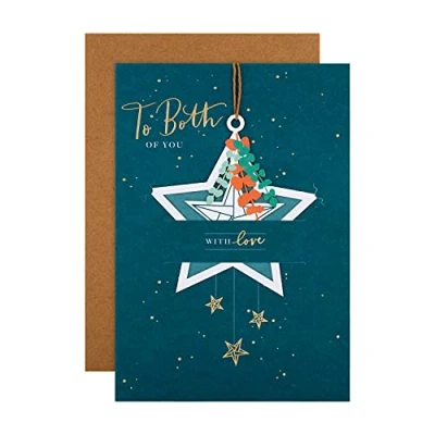 Celebrate two special people and deliver a warm wish and a lasting keepsake at Christmas time, with this simply beautiful card and removable hanging decoration from Hallmark This card is fully recyclable, and made of material from well-managed, FSC-certified forests and other controlled sources. Features Embossed Elements and a Removable Keepsake Decoration with a Natural Twine Hanging Loop Card Comes Complete with a Co-ordinating Hallmark Branded, Kraft Envelope Message Inside Reads: Wishing you a thousand merry moments, each as bright as a Christmas star. Happy Christmas Measures: 22.8 cm by 15.9 cm, Within Standard UK 'Letter' Size Limits