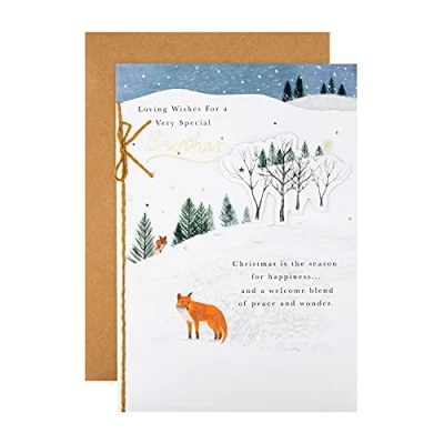 Let a special brother know how much he's loved, at Christmas time and always, with this gorgeous die-cut, illustrated card from Hallmark This card is fully recyclable, and made of material from well-managed, FSC-certified forests and other controlled sources. Features a Die-Cut Design, a 3D Effect Attachment, Gold Foil Lettering and Design Details and a Natural Twine Loop and Bow Element Comes Complete with a Co-ordinating Hallmark Branded, Kraft Envelope Message Inside Reads: Thinking of all the reasons why you're such a wonderful brother and wishing you quiet moments of calm at this special time of the year. Hope You have a very happy Christmas Measures: 22.8 cm by 15.9 cm, Within Standard UK 'Letter' Size Limits