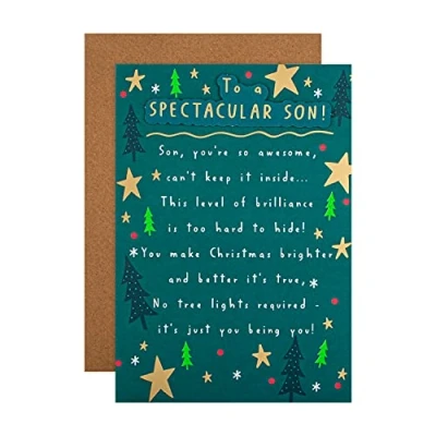 Celebrate a spectacular son and let him know that he lights-up your life with this fun and heartfelt Christmas card from Hallmark This card is fully recyclable, and made of material from well-managed, FSC-certified forests and other controlled sources. Features a 3D Effect Lettering Attachment, Gold Foil Lettering and Design Details Card Comes Complete with a Co-ordinating Kraft Envelope Message Inside Reads: Happy Christmas with loads of love Card Measures: 22.8 cm by 15.9 cm, Within Standard UK 'Large Letter' Size Limits
