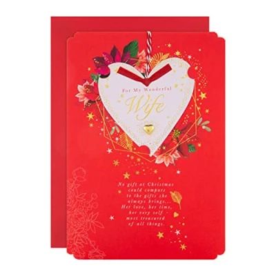 Make sure your wonderful wife knows how much you appreciate her, with this beautiful card from Hallmark This card is fully recyclable, and made of material from well-managed, FSC-certified forests and other controlled sources Printed on high-quality board, this card has a detachable heart shaped keepsake, a red raffia bow, gold paper heart gem, gold foil, embossed details and a paper insert; this card comes complete with a co-ordinating Red, Hallmark Branded Envelope Message Inside Reads: I have a lot to be thankful for, and at the top of the list is you - my wife and my friendthe woman whose love has made so many things right I'll never know what I did to deserve a marriage as good as this, but I do know what's at the very heart of my happiness ... YOU. Wishing you a very merry Christmas with all my love always Measures: 26 cm by 18 cm; Within Standard UK 'Large Letter' Size Limits