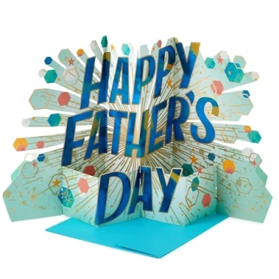 FATHERS DAY CARD: Celebrate the amazing father figure in your life and make him feel super special, with this 3D and pop-up Father's Day card. The perfect way to celebrate your Dad, Step Dad, Grandad and more. 3D & POP UP FATHERS DAY CARD: This card pops-up into a 3D diorama of a Father's Day banner with hexagons, stars and specks. This card features a die-cut design and comes complete with a co-ordinating Hallmark branded, blue envelope. HIGH QUALITY CONSTRUCTION & FULLY RECYCLABLE: This card is fully recyclable, and made of material from well-managed, FSC-certified forests and other controlled sources. MESSAGE: The message on the back reads 'Hope your day is one of a kind!' and includes a space for your own message. This heartfelt message makes it a perfect way to share your joy and best wishes this Fathers Day. SIZE: Flat card measures H30.5cm by W21.9cm and H30.4cm by W30.7cm by D22.2cm when constructed. This card fits within UK 'Large Letter' Postage Size Limits, making it convenient for you to send your warm wishes their home this Fathers Day.