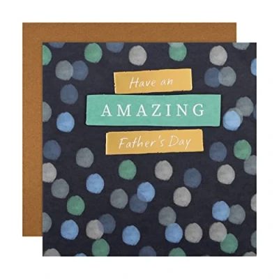 FATHERS DAY CARD: Say a happy Fathers Day to the father figure in your life with this sweet and simple card from Hallmark. The perfect way to celebrate a day all about him, from a dad, step dad, grandad and anyone who deserves recognition. HAPPY FATHERS DAY CARD: Celebrate Father’s Day with style and pizzazz! This card features a blue background with blue spots design, the message Have an Amazing Father's Day' on the front, gold foil elements, embossed details and a 3D attachment. FULLY RECYCLABLE & PREMIUM QUALITY CARD: This card is fully recyclable, and made of material from well-managed, FSC-certified forests and other controlled sources. SIMPLE MESSAGE: Write a special Fathers Day note inside the card that he'll love and accompany it with our message 'Enjoy!'. The perfect way to celebrate an amazing dad on Fathers Day and send the recognition he deserves. CARD SIZE: This card measures 16cm by 16cm and is accompanied with a Hallmark branded, brown Kraft envelope. The perfect size to show off just how much you love your dad, grandad or any other father figure. Within UK Standard 'Letter' Size Limits.