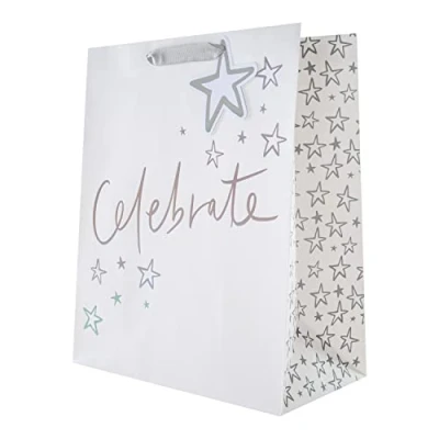 It's time to celebrate with a gorgeous gift or two, presented in this stylish large gift bag from Hallmark. The high-quality construction, large size and portrait orientation will allow it to accommodate a variety of gifts including homewares, books, clothes and more. This product is made using material from well-managed, FSC-certified forests and other controlled sources. Holographic Foil Lettering and Details, Pale Grey Grosgrain Ribbon Handles and Co-ordinating Star-shaped Gift Tag with Holographic Foil Details Perfect for Any Celebration Gift bag Measures: - H 33 cm by W 26.5 cm by D 14.6 cm