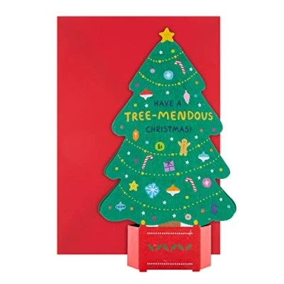 Make this Christmas tree-mendous with this fantastic and festive 3D card from Hallmark This card is fully recyclable, and made of material from well-managed, FSC-certified forests and other controlled sources Printed on high-quality board, this card pops out to become a Christmas tree, and has a die-cut design; this card comes complete with a Red, Hallmark Branded Envelope Message On Back Reads: Have a TREE-MENDOUS Christmas! Measures: 22.8 cm by 13.5 cm; Within Standard UK 'Letter' Size Limits; Constructed Card Measures: 22.8 cm by 13.5 cm by 4.5 cm