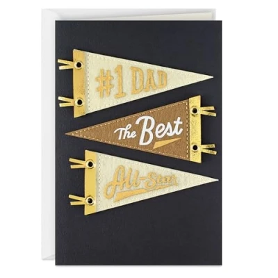 Cheer on an all-star dad with this premium Father's Day card from Hallmark Signature. Front of card features three gold, tan and brown felt pennant attachments that read "#1 Dad," "The Best" and "All-Star" Inside reads: "Hope your Father's Day is the best!" Perfect for celebrating your dad, grandpa, uncle, brother, stepdad, father-in-law or other father figure. Father's Day card measures approximately 5" wide by 7.2" high and comes with a coordinating envelope; Printed on high quality paper stock Hallmark Signature offers stylish shoppers a curated and considered line of upscale and unique cards and gifts that reflect their personal style and make an immediate and lasting impression.