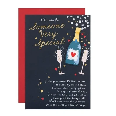 VALENTINES CARD: Be ready to romance your Someone Special and fill their day with love, with this sweet Valentine's Day card from our Sugared Almonds collection. The perfect way to make your girlfriend, boyfriend or partner feel extra special. SOMEONE SPECIAL VALENTINES CARD: This Valentines Card has a champagne bottle and glasses design, features die-cut details, and a sentimental verse on the front to make your someone special's heart burst with love and happiness. HIGH QUALITY CONSTRUCTION & FULLY RECYCLABLE: This card is fully recyclable, and made of material from well-managed, FSC-certified forests and other controlled sources. HEARTWARMING MESSAGE: This card is accompanied with the message 'And now I have you in my life, that lovely dream's come true... So glad I found my someone - so lucky it was you. Happy Valentine's Day'. Perfect for an extra special celebration. PERFECT SIZE: This Valentines Card measures H22.8cm by W15.9cm and is accompanied with a Hallmark branded, red envelope. Fitting within UK ‘Letter’ postage size limits, It's ideal for sending through the mail without any hassle.