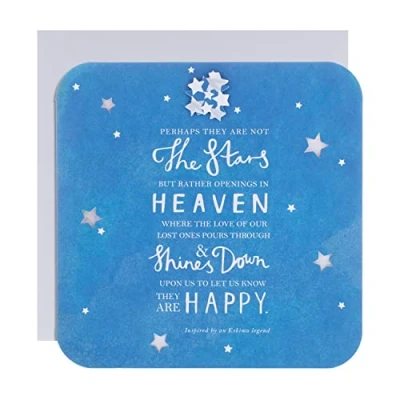 Give them your sympathy, and let them know you're there for them with this beautifully decorated and sentimental Sympathy card from Hallmark This product is fully recyclable, and made of material from well-managed, FSC-certified forests and other controlled sources Printed on high-quality board with rounded edges, a starry 3D add-on and intricate die cut star detail; the card comes complete with a coordinating Light Grey, Hallmark Branded Envelope Message Inside Reads: Wishing you peace at this sad time Measures: 16 cm by 16 cm; Within Standard UK Letter Size Limits