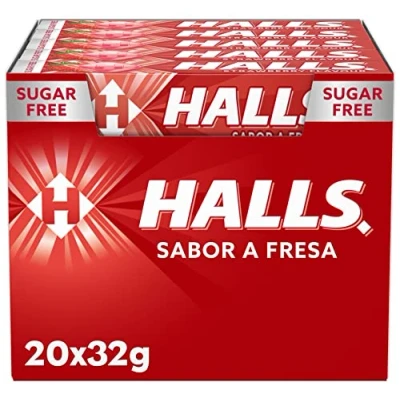 Halls Strawberry Flavored Hard Candy; With Sweeteners, Sugar Free Box of 20 candy sticks with practical pocket format to take them wherever and whenever you want Its intense freshness and flavor will help you refresh at any time of the day Store in cool and dry place Excessive consumption can produce laxative effects; Contains a source of phenylalanine