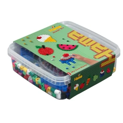 Tin with approx. 600 colourful Hama iron-on beads, motif templates, ironing paper a round peg plate in transparent Includes 10 mm maxi beads, these are recommended for crafting with toddlers from 3 years, ironing should be carried out by an adult Craft beads are versatile and are suitable for the production of pixel pictures, small figures or for plugging, walking and dotting Crafting with beads promotes concentration, fine motor s and creativity in a playful way Original Hama ironing beads and accessories are made from harmless plastic ( from plasticisers such as BPA and phthalates) Create brilliant designs and decorations Simple to use, they help develop a child's creativity Contents: Approx. 600 beads, 1 transparent round pegboard, 2 bead supports, colour printed design sheet, instructions and ironing paper, Manufacturer: Hama