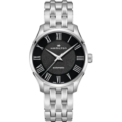 Tradition meets innovation in the Jazzmaster Automatic 40 mm. Roman numerals on the dial add distinctive style and our H-10 movement, with its anti-magnetic NivachronTM balance spring, ensures optimal precision. This analogue watch is equipped with luminous hands and has a Swiss made movement. High-quality silver stainless steel bracelet, 21 cm long and 19 mm wide with folding clasp Housing diameter: 40 mm, Housing thickness: 11 mm, Housing colour: Silver and Dial colour: Black Water Resistant: 5 Bar -Weight: 150g The watch comes in a beautiful gift box with a 2 year warranty