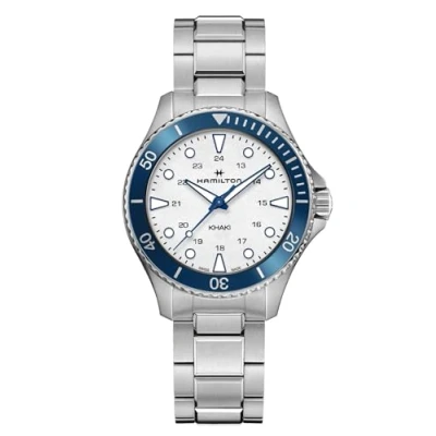 Explore in high-seas style with this Khaki Navy Scuba Quartz. This Analogue watch is equipped with a Luminous Hands, Luminous Numbers and has a Swiss Made movement Premium Silver Stainless steel strap, measuring 21 cm in length and 18 mm in width, with a Sapphire glass. Case diameter: 37 mm,case thickness: 11 mm, case colour: Silver and dial colour: White Water resistant: 10 bars-Weight: 148 g The watch is delivered in an original gift box and has a warranty of 2 years