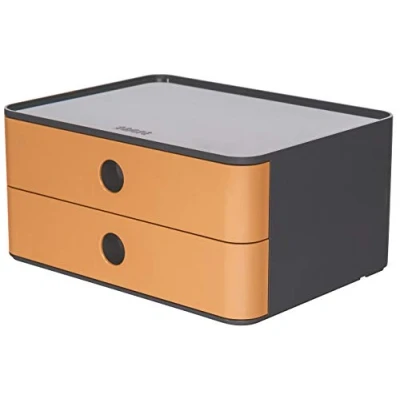 Premium Quality 2 Drawer Stackable Drawer Storage Box with Removable Compartments Unique and innovative design in a high-gloss finish for a wide range of uses: in the office, meeting or at home. Smooth running drawers with removable divider for organizing. Includes cable holder in the base frame. Non-slip rubber feet that protect furniture. Stackable with multiple Allison's or SMART organisers. (Item number: 1110) Made of very high quality sturdy ABS plastic. Box contents: 1 x HAN 1120-83, SMART-BOX ALLISON, design drawer box stackable with 2 drawers, external dimensions (W x D x H): 260 x 195 x 125 mm. Internal dimensions of the drawer: 235 x 160-180 x 50 mm Case colour: granite grey. Drawer colour: caramel brown, original Han branded product. Design protected. Made in Germany.