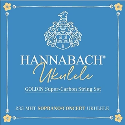 Hannabach Ukulele Strings Soprano / Concert, Goldin, Set 235MHT, medium-high-tension For soprano ukulele with 330-350 mm scale length and concert ukulele with 380 mm scale length, Total length of strings 640 mm, In tension very balanced set made of the legendary Hannabach Goldin Super-Carbon. Very brilliant and warm sound, Since CARBON strings are very thin and smooth, we recommend tying 1 or 2 knots at the knot bridge to prevent the strings from slipping and damaging the instrument, Colour coding to identify the individual strings. Tone / Identification / Diameter / Tensions: A1 red identifier: 0.58mm/.022", Soprano: 4.8kg/10.58lbs, Concert: 5.2kg /11.46lbs, E2 green identifier: 0.70mm/.028", Soprano: 4.4kg/9.70lbs, Concert: 4.8kg/10.58lbs, C3 black mark: 0.87mm/.034", Soprano: 4.4kg/9.70lbs, Concert: 4.8kg/10.58lbs, G4 blue mark: 0.61mm/.024", Soprano: 4.4kg/9.70lbs, Concert: 4.8kg/10.58lbs No single strings available. We recommend replacing the set completely to ensure a consistent sound