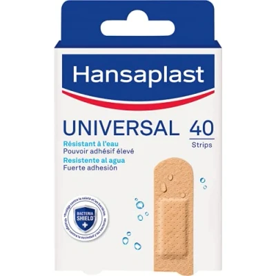SURFACE INJURIES - Precut universal plasters of different sizes effectively protect injuries from bacteria and other impurities. PROTECTIVE COMPRESS: The integrated compress forms a pad to protect the wound and facilitate removal of the adhesive dressing painlessly. Waterproof Plasters - Waterproof plasters protect small wounds even when showering or washing hands. Application Tips: Clean and disinfect the wound. Dry the skin with caution. Apply the sealing plaster, without stretching the desired size. Packaging – Hansaplast Universal 40 plasters, children's and adult plasters of different sizes (20 small, 10 medium, 2 large and 8 round), universal skin colour tape