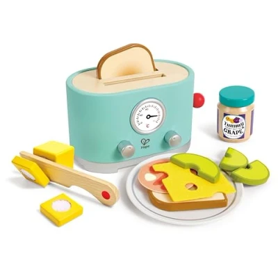 DEVELOPS IMAGINATION: Children engage in imaginative scenarios and role-playing, fostering creativity, storytelling skills, and cognitive growth. PERFECTING MOTOR SKILLS: Manipulating the toaster lever, inserting play food, and picking up toasted slices promote hand-eye coordination and fine motor skills LEARNING ABOUT FOOD: Through play, children might explore different types of toast enjoyed in various cultures, promoting cultural awareness. Plus conversations about healthy toppings and balanced meals can foster an early interest in nutrition and eating well FUNCTIONAL ELEMENTS: The toaster has a lever that can be pushed down then it makes a a ticking sound for 6 seconds and 'dings' as the toast pops out MODERN AESTHETIC: This toaster comes in a stylish and modern design with functional elements and accessories FULL OF ACCESSORIES: This set includes one toaster, two toast pieces, three avocado slices, 'sliceable' butter, jame, ham, cheese, one knife and a plate, Manufacturer: Hape