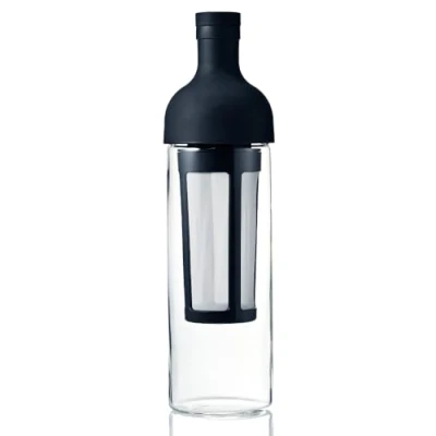 This bottle features HARIO's heatproof glass. The tall cylindrical glass bottle is easy to hold and pour. This bottle is compact and can be easily stored in a fridge door or cabinet. The filter is removable for cleaning.