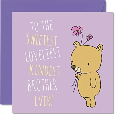 MAKE HIM SMILE WITH THIS BEAUTIFUL HAPPY BIRTHDAY CARD BROTHER: This exceptional quality birthday day card for her shows the design "To The Sweetest Loveliest Kindest Brother Ever!". If you are looking for beautiful birthday greetings cards for him, then this happy birthday day card is bound to make them smile. Not just for birthday day gifts for Him this could also be a Christmas card, Congratulations card, Fathers day Card. WHAT DO YOU GET: The card is printed on one side and BLANK ON THE INSIDE to allow you to write your very own message. The unique fun design is printed on a specially sourced and environmentally responsible board. At 360 microns thick and 300gsm the natural white one-sided gloss board has a quality look and feel. Supplied with a coloured gummed envelope to complement the design and ready to be sealed and sent in the post. NO INK SMUDGES: There is nothing worse than writing inside a card to find that the shiny surface makes the ink smudge. This is why we use a high quality one sided coated board. The uncoated side will absorb more of the ink from your pen to make smudging a thing of the past. Happy birthday Brother SIZES: Greeting Card = 145mm x 145mm, Envelope = 155mm x 155mm, Card Weight 300gsm, Card Thickness = 360 micron. Son Child birthday day cards from Mother, Father. Him birthday cards from Parents Fiance birthday card Mummy, Mother birthday card, Mum birthday cards from Son, Hub cards birthday, special Hubby birthday cards, Husband 50th birthday card, birthday card Him from Daughter or Son MADE AND QUALITY CHECKED IN THE UK: We print and manufacture all our product right here in the UK so you can be sure of a fast turnaround and a product that is expertly made. Using the very best Forest Stewardship Council certified board our card is conscious of the responsible management of the world's forests - birthday cards Auntie, Dad, birthday card Father, Step Dad birthday card, Dads birthday card.