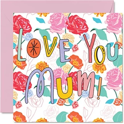 MAKE MUM SMILE WITH THIS SWEET MOTHERS DAY CARD: This exceptional quality mothers day card for her shows a fun floral design saying "Love You Mum!". If you are looking for beautiful greetings cards for her, then this happy mothers day card is bound to make them smile. Not just for mothers day for Mum this could also be for birthdays for Mother, Mummy, Mom, Mama, Mama, or Mommy. WHAT DO YOU GET: The card is printed on one side and BLANK ON THE INSIDE to allow you to write your very own message. The unique stylish design is printed on a specially sourced and environmentally responsible board. At 360 microns thick the natural white one-sided gloss board has a quality look and feel. Supplied with a coloured gummed envelope to complement the design and ready to be sealed and sent in the post. NO INK SMUDGES: There is nothing worse than writing inside a card to find that the shiny surface makes the ink smudge. This is why we use a high quality one sided coated board. The uncoated side will absorb more of the ink from your pen to make smudging a thing of the past. Happy mothers day Mum cards, Mam birthday card, Mom birthday cards. SIZES: Greeting Card = 145mm x 145mm, Envelope = 155mm x 155mm, Card Thickness = 360 micron. Great mum mothers day cards from Daughter or Son. Mum birthday cards from Daughter, cards for Mum, card Mum, Mother day card, Mum day cards from Son, Mum cards birthday, special Mum birthday cards, mothers card Mum from Daughter. MADE AND QUALITY CHECKED IN THE UK: We print and manufacture all our product right her in the UK so you can be sure of a fast turnaround and a product that is expertly made. Using the very best Forest Stewardship Council certified board our card is conscious of the responsible management of the world's forests - birthday cards Mum, birthday card Mother, Step Mum birthday card, Mums birthday card.