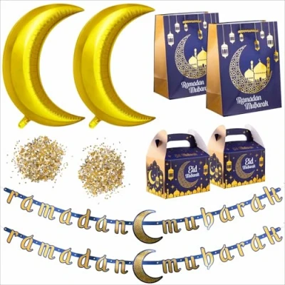 Complete decoration set: the 10-piece Ramadan & Eid decoration set offers everything you need for an atmospheric and festive atmosphere during Ramadan and Eid. With stylish elements such as gift bags, decorative folding boxes, confetti and two party chains, every celebration becomes a special highlight. Easy to use and versatile, this set will bring joy to family, friends and guests. Elegant and festive design: the set impresses with classic motifs such as stars, moon and the lettering "Ramadan Mubarak" or "Eid Mubarak". The shiny and modern designs bring a festive atmosphere to your table or in the room and provide a stylish ambience. Versatile uses: our decoration set is ideal for Ramadan celebrations, the Eid festival or iftar. It is the perfect choice to give your table a harmonious and elegant look and impress your guests. PRACTICAL GIFT BAGS & FOLDING BOXES The Ramadan Mubarak gift bags and the Eid Mubarak gift folding boxes are ideal for stylishly wrapping small gifts, sweets or party favours. They offer enough space and are sturdy enough for various surprises. High quality: Heku is known for its high-quality and reliable products. With this set, you can be sure that you are receiving products that meet high standards in both quality and sustainability. You can trust that your guests will be satisfied with the items and your event will go smoothly., Manufacturer: HEKU