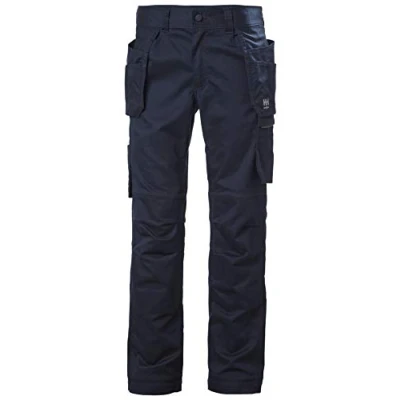 2-way mechanical stretch fabric Hanging pockets with double lined bottom for durability Gusset in crotch for freedom of movement Plastic covered metal buttons Items delivered: 1x Helly Hansen Workwear Manchester Cons Pant - Navy C44