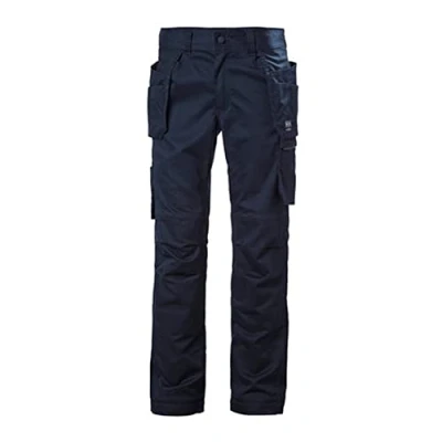2-way mechanical stretch fabric Hanging pockets with double lined bottom for durability Gusset in crotch for freedom of movement Plastic covered metal buttons Items delivered: 1x Helly Hansen Workwear Manchester Cons Pant - Navy C52