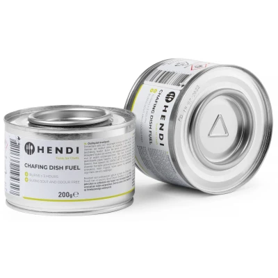 CookinglifeHendi Burning paste is made of natural (bio) ethanol alcohol mixed with water and a thickener. Fire paste is artificially made so bitter that it cannot be swallowed. To heat chafing dishes (hot containers) you need special burning paste holders. The burning time is about 3 hours. * 200 Gram cans only suitable for chafing dishes * Burning time: 3 hours per can * Per 24 cans Fire paste is a mixture of ethanol alcohol, mixed water and a thickener. Hendi Fire paste cannot be swallowed because it is artificially made very bitter. The cartouches and cans get hot very quickly and therefore should always be placed in a fuel paste holder to prevent fire hazard! In addition, it is also important that there are no fire or heat sources in the vicinity. You can light the fuel paste when the cans in the fuel holders are in their final position. Also, no (condensation) water should get into the burning paste as this can cause dangerous splashes. Extinguish the fuel only with the lid of the fuel holder. To refill the fuel, the canister and holder must be completely cool. Then remove the canister from the holder so that no burning gel gets onto the holder. Then remove the drippings immediately with an old cloth. Fire paste should always be stored in a sealed container in a dark, well-ventilated room cooler than 20 degrees.