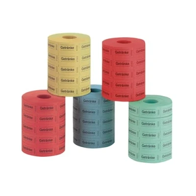 Catering, hotel industry form beverage brand, 5 x 1000 tear-offs Paper design: 135 g/m², ticket box Drinks print Roll consecutively numbered Paper size: 57 x 30. Colour: yellow, green, blue or red. 1000 sheets per roll, five rolls (one colour) shrink-wrapped