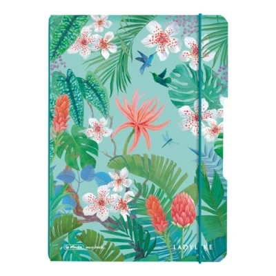 Notebook flex A5 with PP interchangeable cover 40 sheets of wood-free white 80 g/m² paper, ruling: dotted, FSC mix With rounded corners and green elastic closure Design: Ladylike Jungle