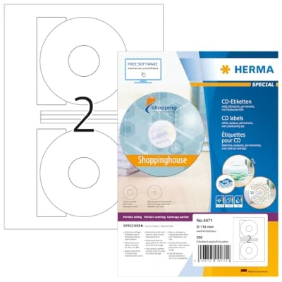 Cd labels A4, Ø 116 mm, White opaque, permanent adhesion 100% opaque: surface of the CD does not shine through Positioning aid on each label permits dead-centre placement, reliable adhesion, even in high-speed drives Suitable for inkjet printers, laser printers and copiers, perfect printing results in black-and-white or colour Design your labels professionally and for free with our Online software and practical templates. Visit herma /free-software