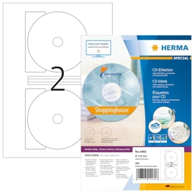 Cd labels Maxi A4, Ø 116 mm, White opaque, permanent adhesion 100% opaque: surface of the CD does not shine through Positioning aid on each label permits dead-centre placement, reliable adhesion, even in high-speed drives Suitable for inkjet printers, laser printers and copiers, perfect printing results in black-and-white or colour Design your labels professionally and for free with our Online software and practical templates. Visit herma /free-software