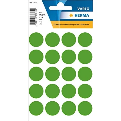 For marking and highlighting important information and markings with a signal character Ideal for bulletin board and flip chart, meetings, presentations, holiday planners and goods receipt Environmentally friendly and sustainable: solvent-free pressure-sensitive adhesive, chlorine-free bleached and FSC-certified Can be written on with all standard writing instruments, not suitable for printing with PC Box contents: 100 x HERMA colour dots, diameter 19 mm, round, dark green (5 sheets of 20 labels each)