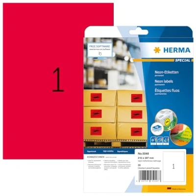 HERMA Self Adhesive Coloured Labels, 1 Label per A4 Sheet, 20 Sheets, 210 x 297 mm, Blank Colour Labels Stickers, Sticky for Laser & Inkjet Printer, Neon Red