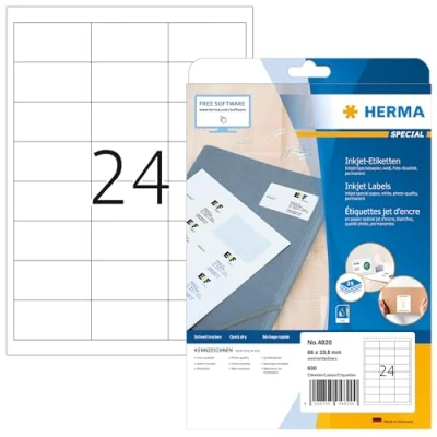 HERMA Self Adhesive Multipurpose Inkjet Labels, 24 Labels per A4 Sheet, 25 Sheets, 66 x 33.8 mm, 600 Blank Universal Stickers, Sticky for Printer, White