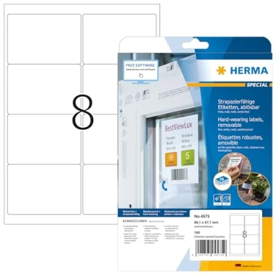 AmazonWeatherproof film labels A4, 99.1 x 67 mm, White, extremely strong adhesion, removable Removable without residue. For labels that are subject to high stresses outdoors and are frequently changed. Extremely hard-wearing UV light Ideal for identification of Items in storage and production facilities, barcode labels, information signs, labelling of property and inventories Suitable for laser printers and copiers, perfect printing results in black-and-white and colour, not for inkjet printers Design your labels professionally and for free with our Online software and practical templates. Visit herma /free-software