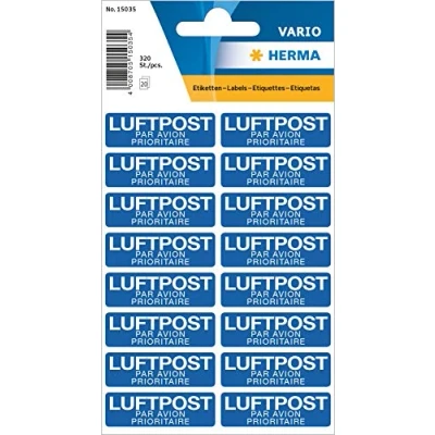 Warning sticker with high attention effect for sending all types of mail via air mail Made from particularly high-quality materials, convince in rated Herma quality Environmentally friendly and sustainable: solvent-free pressure-sensitive adhesive, chlorine-free bleached and FSC-certified Permanent adhesive warning labels stick securely and permanently to most surfaces Box contents: 10 x HERMA information labels, 40 x 12 mm, rectangular, bright red (5 sheets of 2 labels)